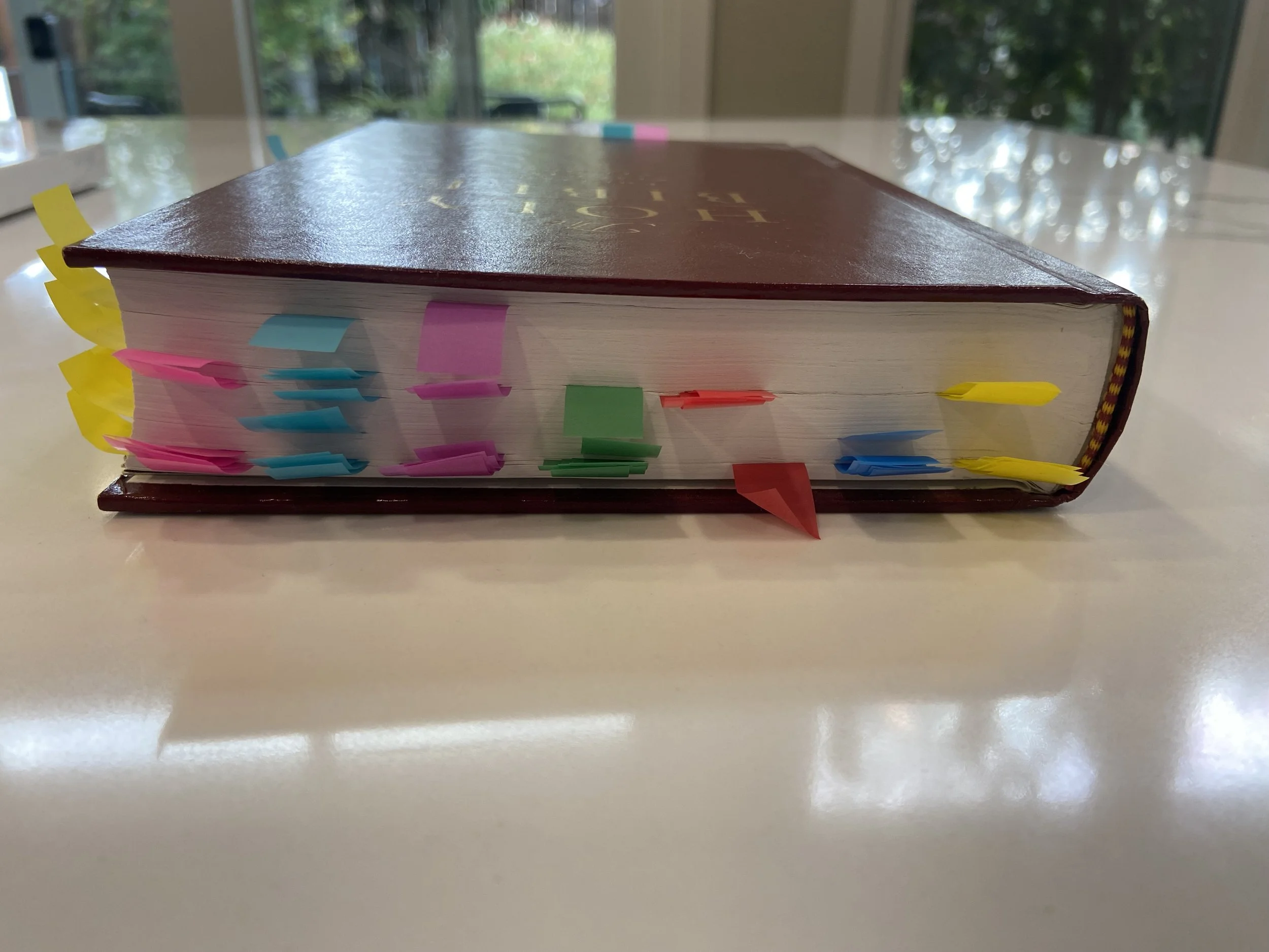 For each topic, I highlight the verse in a certain color. For instance pink for all the lying verses and green for all the verses on complaining. Then I added a pink-colored tab to each page where I marked the bible verses for lying and a green-colored tab for every place I marked the verses for complaining.